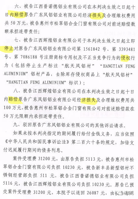不久前,关于广东凤铝铝业有限公司与惠州市松翠铝合金门窗有限公司、新丰县新型铝材不锈钢经营部、江西普诺德铝业有限公司、江西辉煌铝业有限公司侵害商标权及不正当竞争纠纷一案,一审划上圆满句号。辉知队对侵权行为零容忍,代理原告严格追究侵权者责任,以法释法,以法普法,获法院支持,最终法院判决四被告停止侵权并赔偿损失共计250余万,判决结果如下: